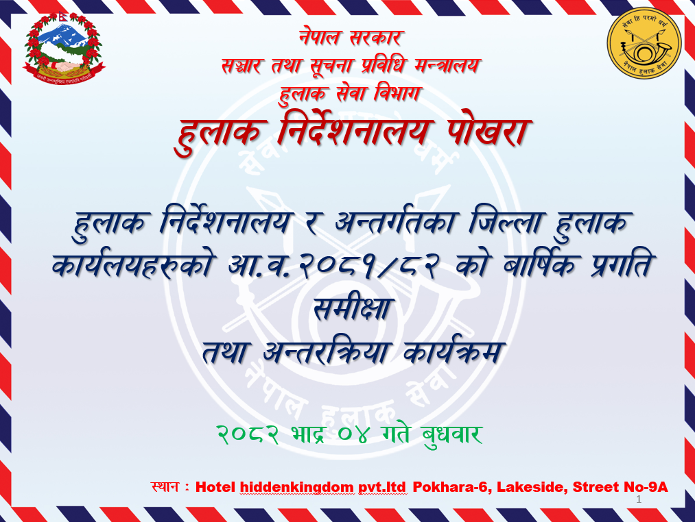 हुलाक निर्देशनालय पोखरा र अन्तर्गतका जिल्ला हुलाक कार्यालयहरुको आर्थिक वर्ष २०८१/०८२ को वार्षिक समिक्षा गोष्ठी (२०८२ भाद्र ४ गते बुधवार)